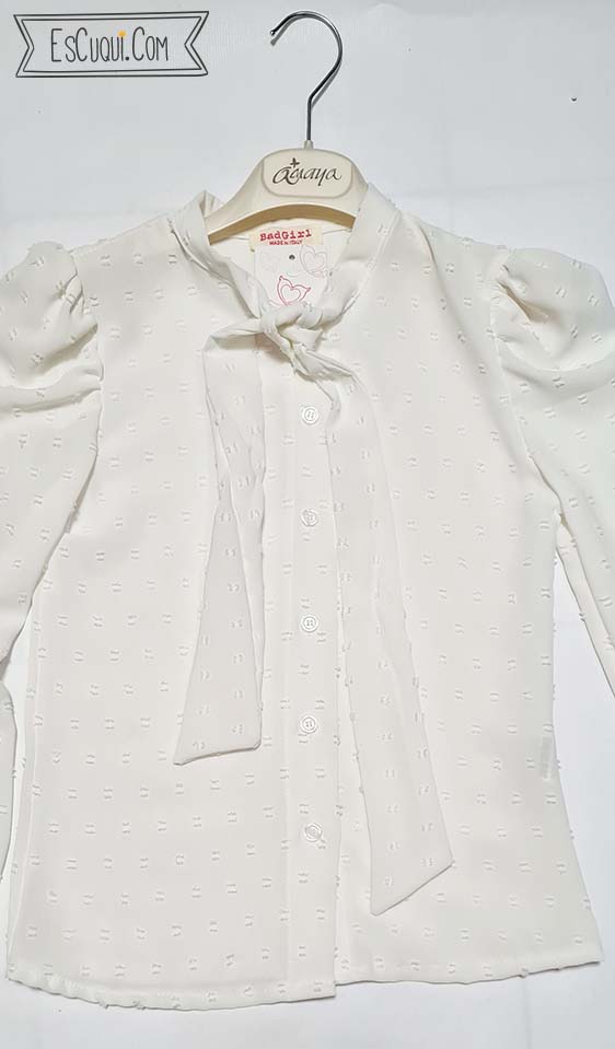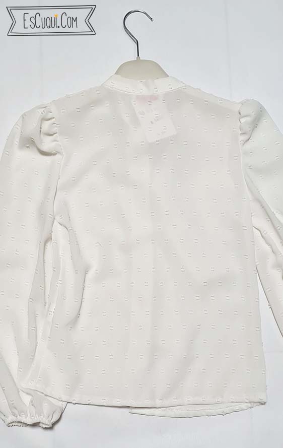 Blusa de niña blanca elegante de plumeti con lazo al cuello, mangas largas abullonadas y cierre frontal de botones; ideal para ocasiones especiales o looks diarios con un toque elegante. El lazo al cuello aporta un aire de “bow blouse” muy cuqui.