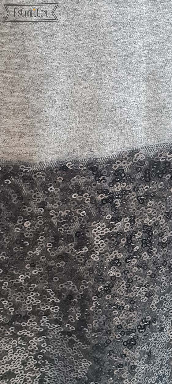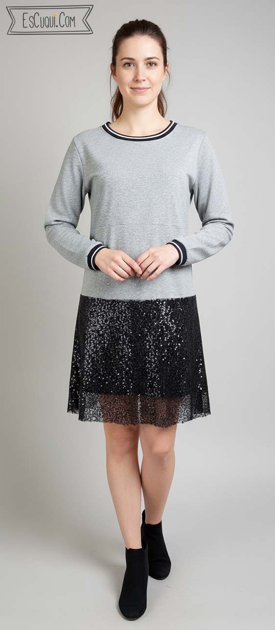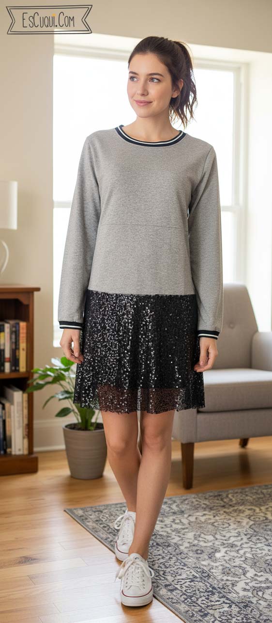Comodidad y brillo en una sola prenda: parte superior tipo sudadera gris suave y falda de tul con lentejuelas negras para un look casual-chic que funciona.