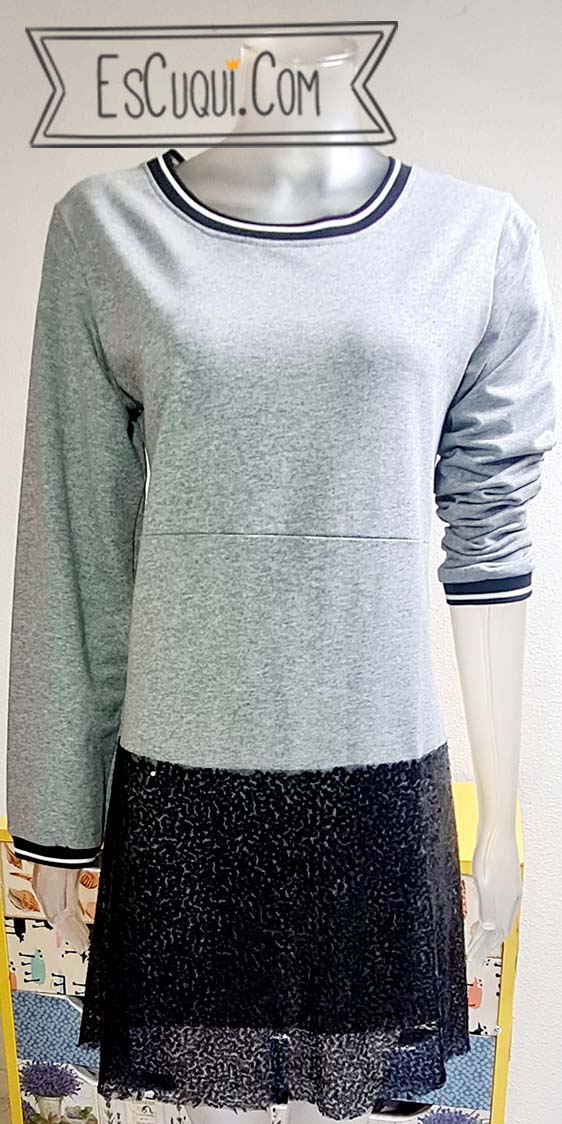 Diseño 2 en 1: cuerpo de sudadera ligera en gris jaspeado y bajo con superposición de tul con lentejuelas para un contraste moderno.